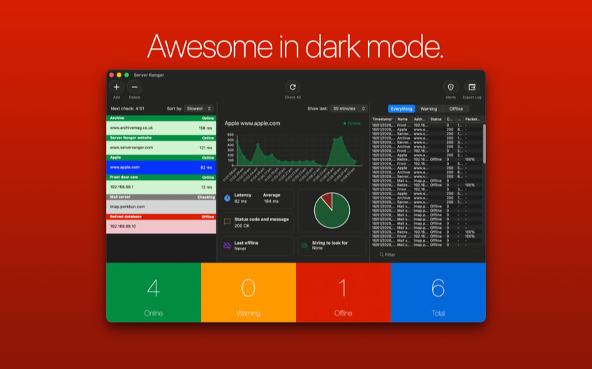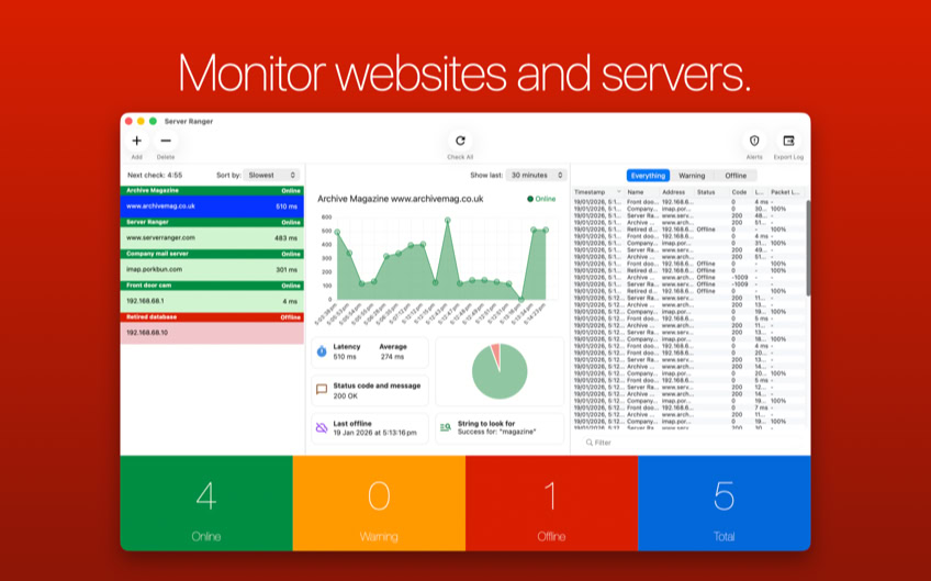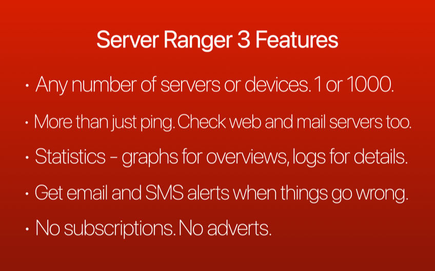 "Monitoring a bunch of VPS, shared hosting accounts, and local servers is so much easier with Server Ranger. I used to use free online services which always seemed to require multiple accounts for multiple sites, but I just run Server Ranger on my Mac now and reduce the hassle. The app is great. Seriously. If you have servers to monitor, you need this."