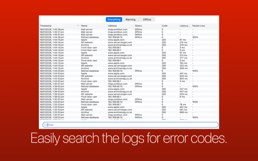 Server Ranger logs every response from your devices. Spot patterns of poor performance and print or export the evidence to a CSV file.